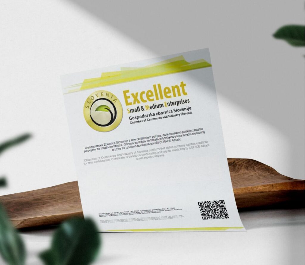 Podjetje je tudi prejemnik več priznanj / Certifikat bonitetne odličnosti AAA, Certifikat poslovne odličnosti Excellent SME Slovenia /, ki so potrditev kakovostnega dela podjetja.